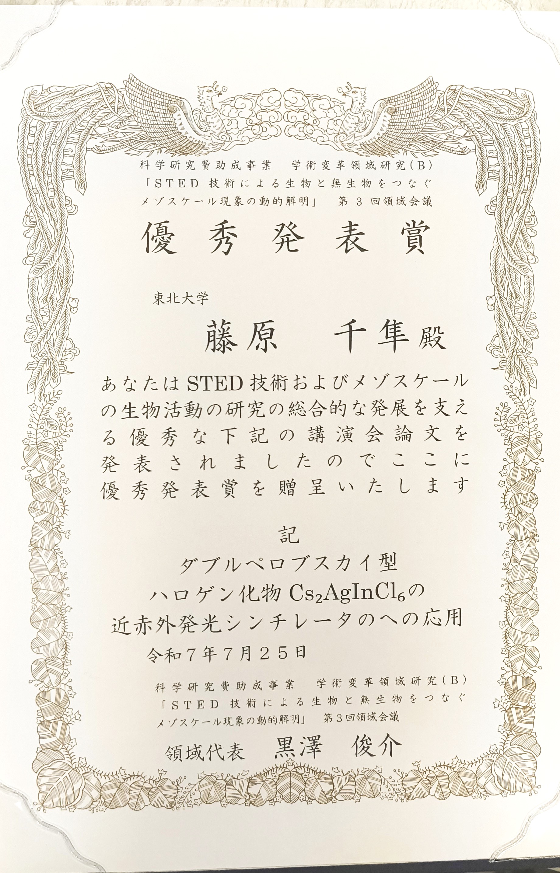 ・2025/7/25 : 🏆 科学研究費助成事業・学術変革領域研究(B)「STED 技術による生物と無生物をつなぐメゾスケール現象の動的解明」の第3回領域会議で優秀発表賞を受賞しました。